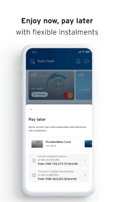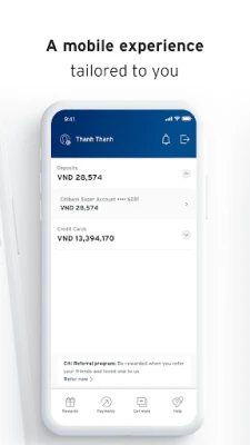 Disclaimer: The use of this Citibank VN Mobile app is for the customers of Citibank, N.A., - Ho Chi Minh City Branch and Hanoi Branch (Citibank VN) only. Content provided via this Citibank VN Mobile app is not specifically created for any territory other than where Citibank Vietnam operates/is licensed to operate.