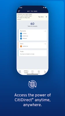 CitiDirect® clients must be specifically entitled for access and users should contact their organization’s Security Administrator for access prior to downloading the application. If this step is not completed, the application can be downloaded; however, access will be denied upon log in.