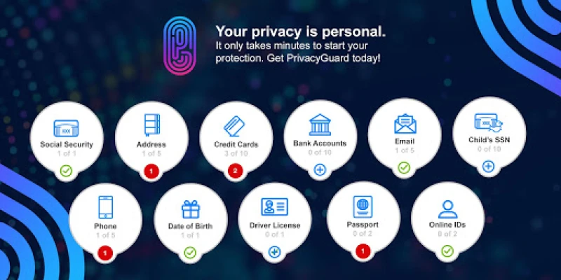 3. PrivacyGuard monitors your current or past mailing addresses, phone number, email addresses, bank accounts, passport, driver's license, Social Security number, child's Social Security number, and date of birth on the Internet based on a search of Internet directories; plus up to ten registered credit cards or debit cards, up to ten registered bank accounts.
