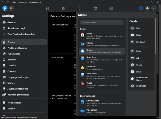 Além da seção social, O Facebook nos permite acessar o Facebook Watch, o Facebook Gaming e o Facebook Marketplace. Nessas áreas encontraremos vídeos populares, conteúdo relacionado a videogames e um mercado para comprar e vender itens de segunda mão. Finalmente, podemos ajustar nosso perfil e configurações de privacidade para controlar quem vê o que postamos na rede social.