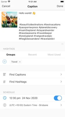 Write your captions in advance and perfect them. Save your hashtag groups within the app and add them to new posts at a press of a button.
